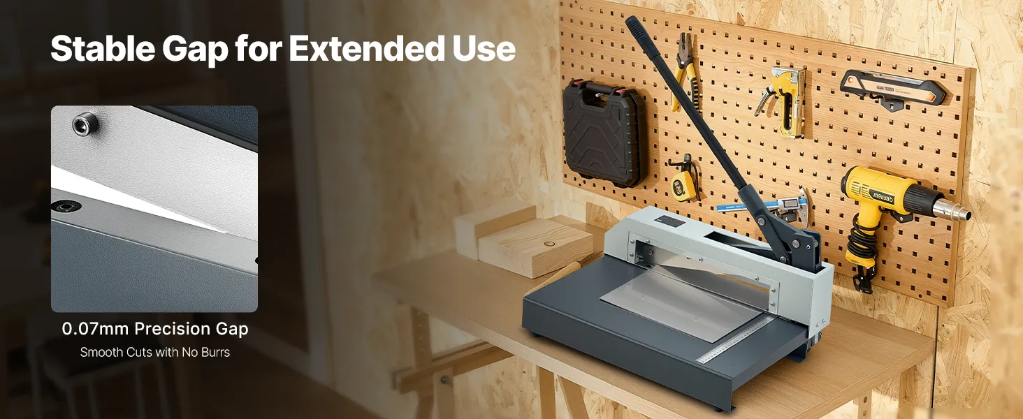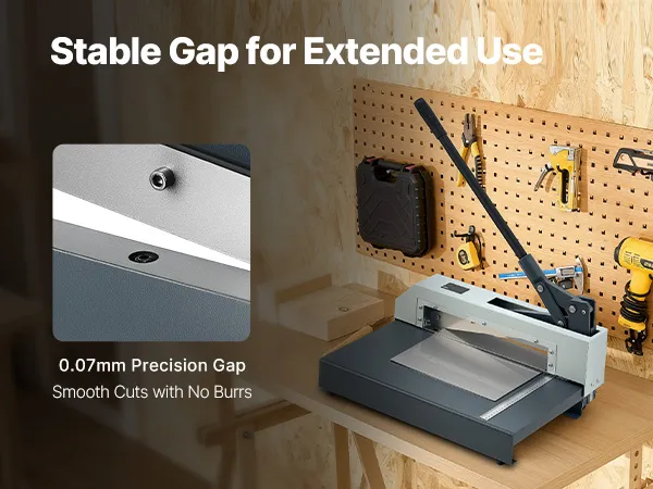 Controllo esatto della distanza tra le lame: con una distanza di precisione <0,07 mm, questa cesoia per metalli supera facilmente il test della carta, garantendo un allineamento ideale delle lame e riducendo le sbavature