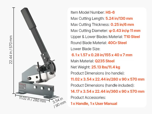 Questa cesoia per lamiera è ideale per il taglio di alluminio, acciaio inossidabile e acciaio a basso tenore di carbonio. È dotata di lame T10 e di una lama tonda in acciaio 40Cr, con una lunghezza di taglio massima di 13 cm, uno spessore di 6 cm e una capacità di taglio di 11 cm.