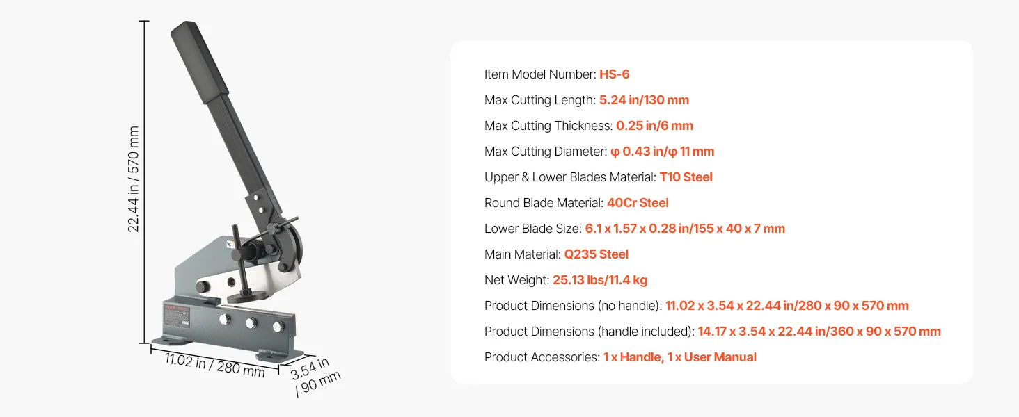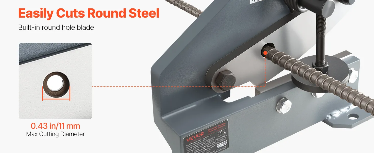 Taglio ad alta efficienza: questa cesoia per metalli può gestire facilmente materiali più grandi, con una lunghezza di taglio massima di 5,12 pollici/130 mm, uno spessore di 0,24 pollici/6 mm e un diametro dell'acciaio tondo di 0,43 pollici/11 mm