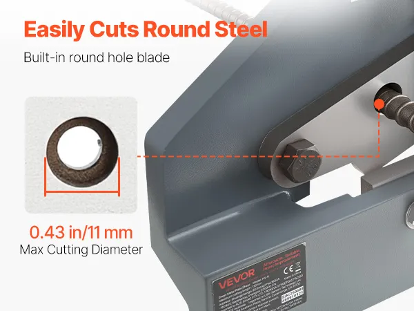 Molto più di una semplice taglierina per lamiera. Questa macchina è dotata di una lama a foro tondo progettata che consente di tagliare barre d'armatura e altri materiali tondi. Con un diametro di taglio massimo di 11 mm, è uno strumento versatile per l'uso in officina.