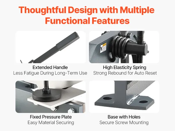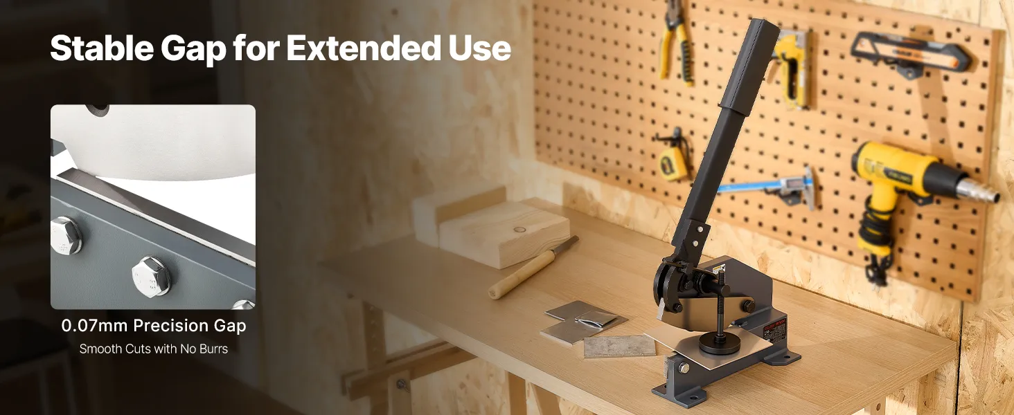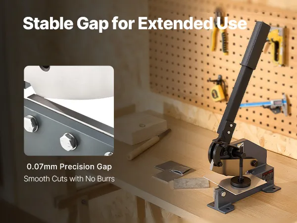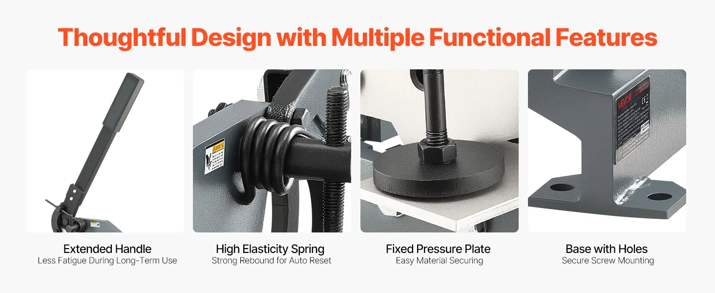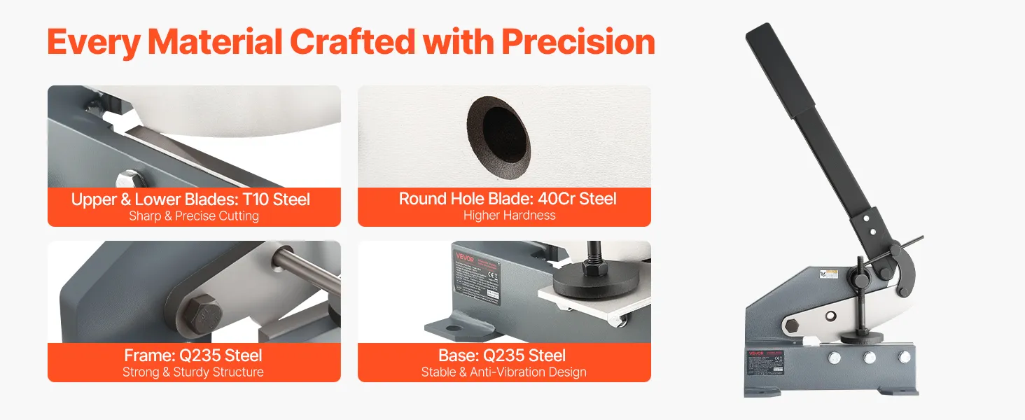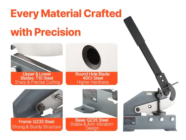 Materiali resistenti: le nostre cesoie sono dotate di lame in acciaio T10 e di una lama a foro tondo 40Cr, tutte trattate termicamente a HRC52-54 per tagli netti e precisi che resistono al rotolamento dei bordi