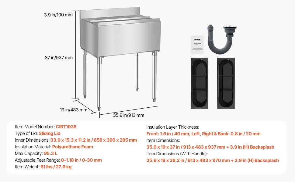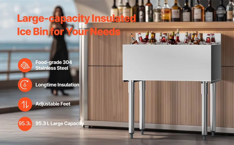 VEVOR Contenitore per Ghiaccio Commerciale in Acciaio Inox da 95,3 L Contenitore per Ghiaccio Sottobanco 913 x 483 x 937 mm con Coperchio Scorrevole e Piedini Regolabili, per Bar, Ristorante, Pub
