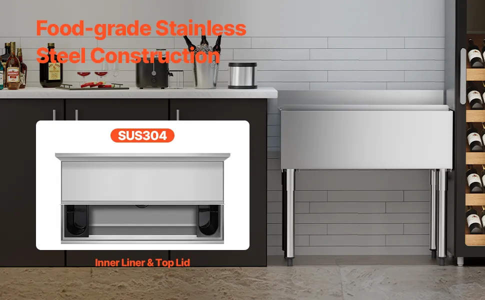 Il nostro contenitore per ghiaccio sottobanco è realizzato in acciaio inossidabile 304 per uso alimentare. Il rivestimento interno e il coperchio sono realizzati in acciaio inossidabile 304 per uso alimentare per garantire durata e sicurezza.