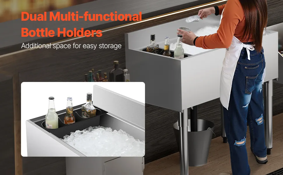 Il nostro contenitore per ghiaccio sottobanco commerciale è dotato di due portabottiglie, ciascuno dei quali contiene tre bottiglie. Risolve il problema di stoccaggio di mixer o bevande usati di frequente, semplificando il processo di stoccaggio e fornendo spazio extra.