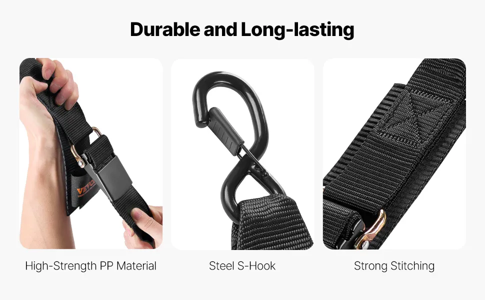 Durevoli e affidabili: realizzate in materiale PP ispessito, queste cinghie a cricchetto retrattili sono resistenti all'usura, alla corrosione e alle intemperie, mantenendo prestazioni eccellenti anche dopo un uso prolungato e attrito. Entrambe le estremità sono dotate di ganci a S rivestiti in PVC, resistenti alla corrosione, robusti e infrangibili, con una chiusura di sicurezza per evitare rischi di sganciamento