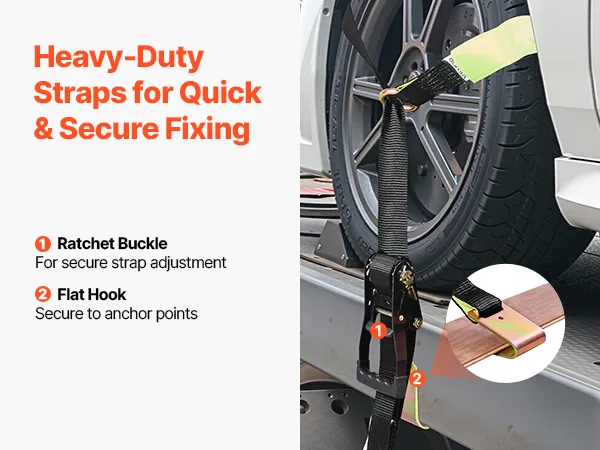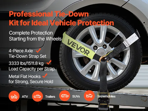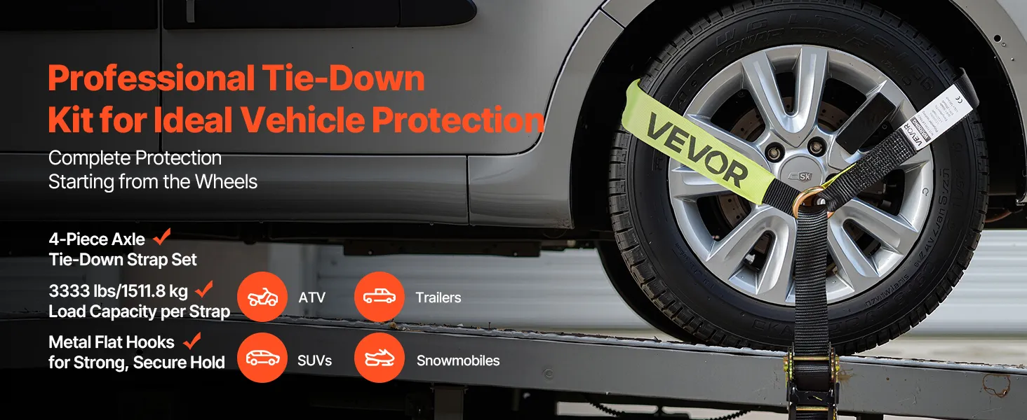 Il nostro kit di fissaggio ruote consente un fissaggio rapido e semplice degli pneumatici direttamente al pneumatico. Ogni cinghia supporta fino a 1512 kg e mantiene il veicolo in posizione durante il trasporto o il parcheggio.