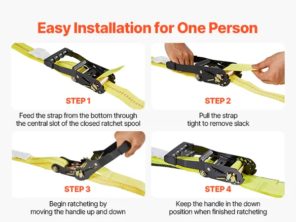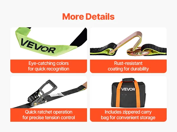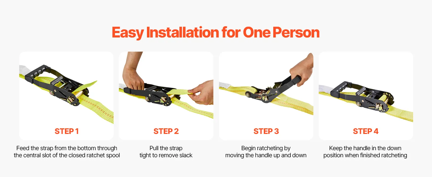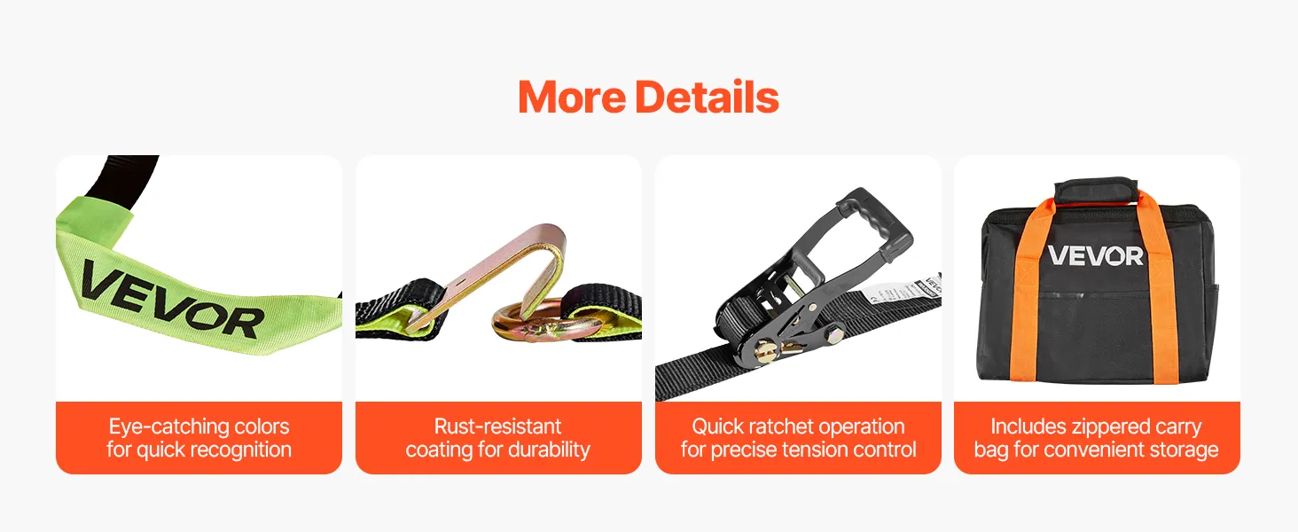 Elevata capacità di carico: grazie alla cinghia ad alta resistenza, la cinghia a cricchetto non si allenta né si strappa facilmente. Può supportare fino a 1512 kg e ha una resistenza alla rottura di 4540 kg