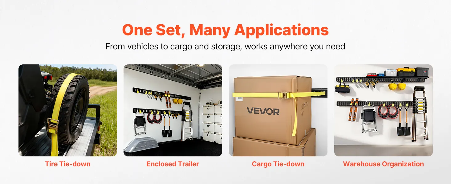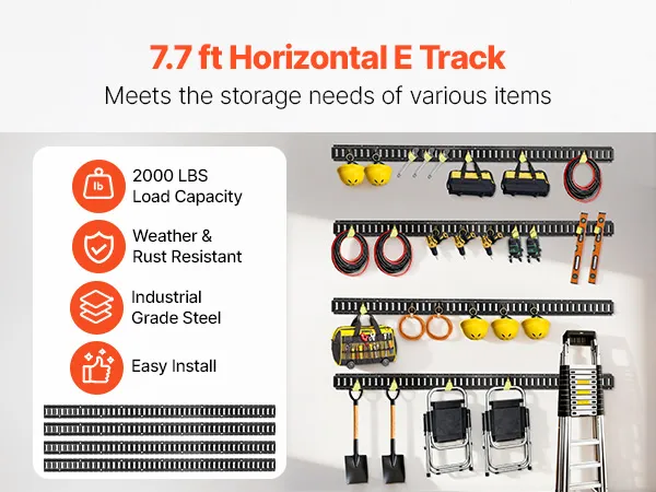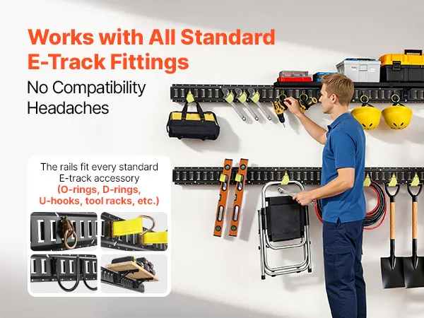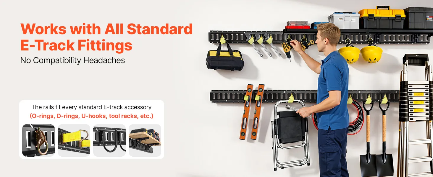 Adatto agli accessori E-Track: possiedi già l'attrezzatura E-Track. Queste guide di fissaggio E-Track si adattano a tutti accessori standard: ganci a U per utensili, rastrelliere per trapani, staffe per ripiani per contenitori, persino portacavi