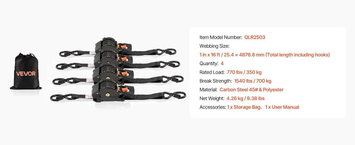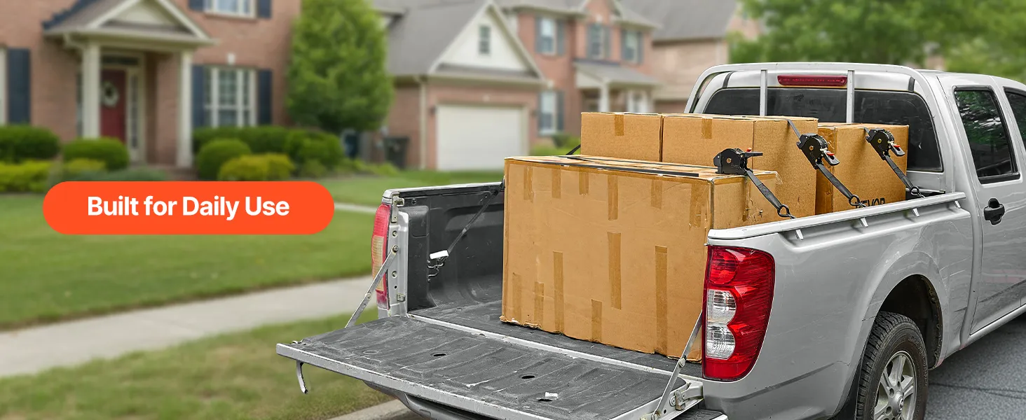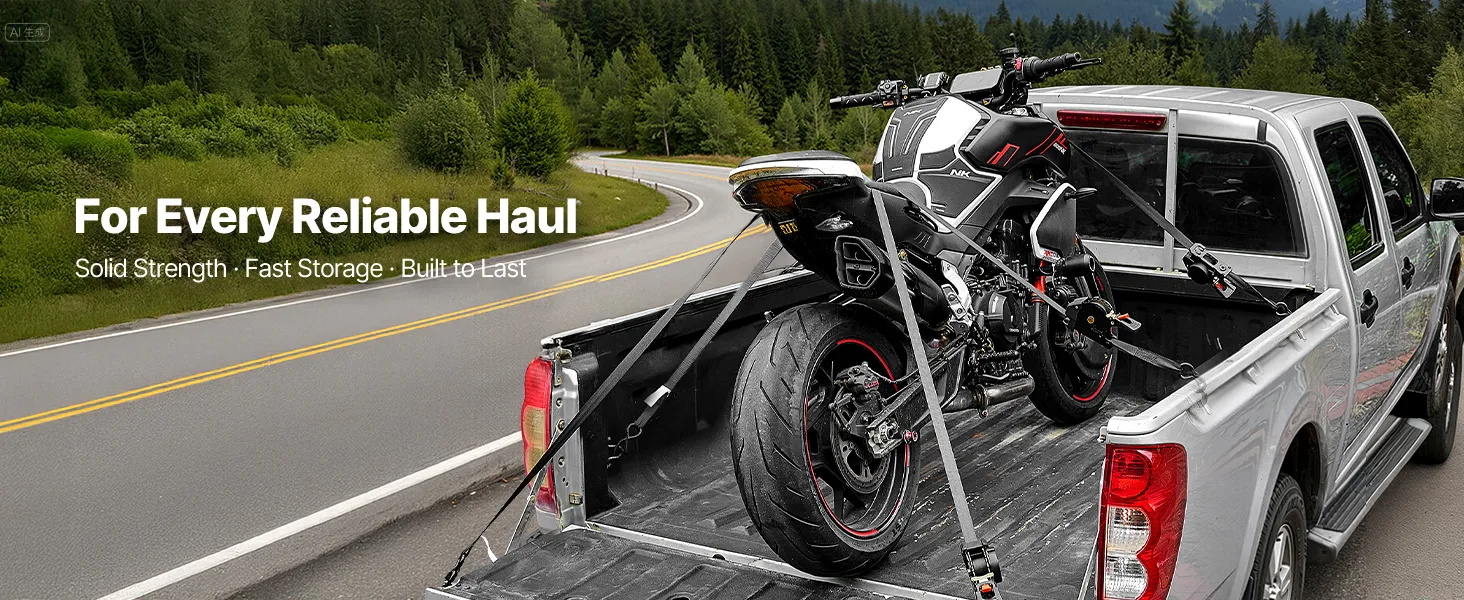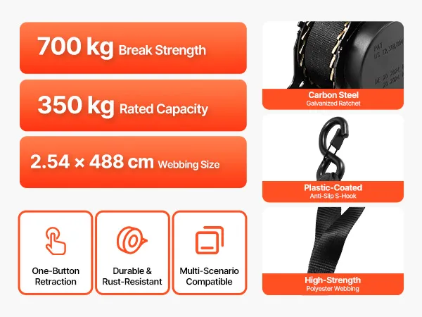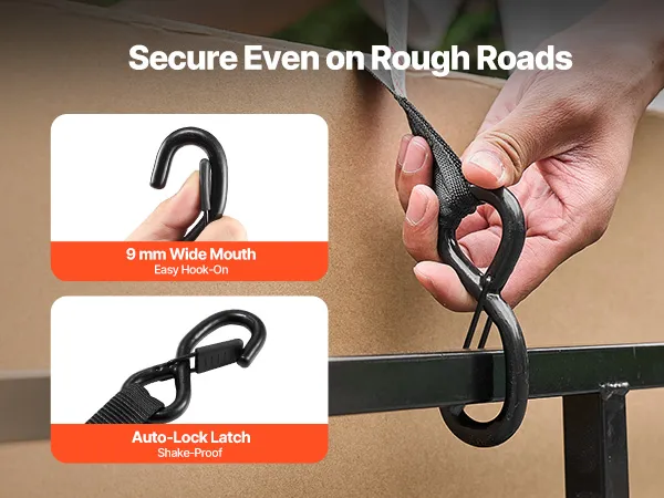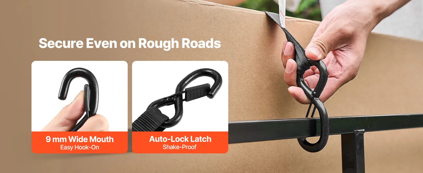 Struttura resistente alle intemperie: il cricchetto della cinghia di fissaggio del carico è in acciaio al carbonio verniciato a polvere, i ganci a S sono rivestiti in vinile e la cinghia è in poliestere. Questa combinazione resiste alla luce solare