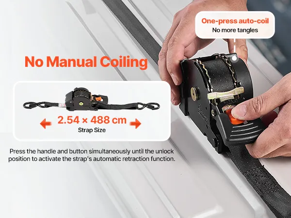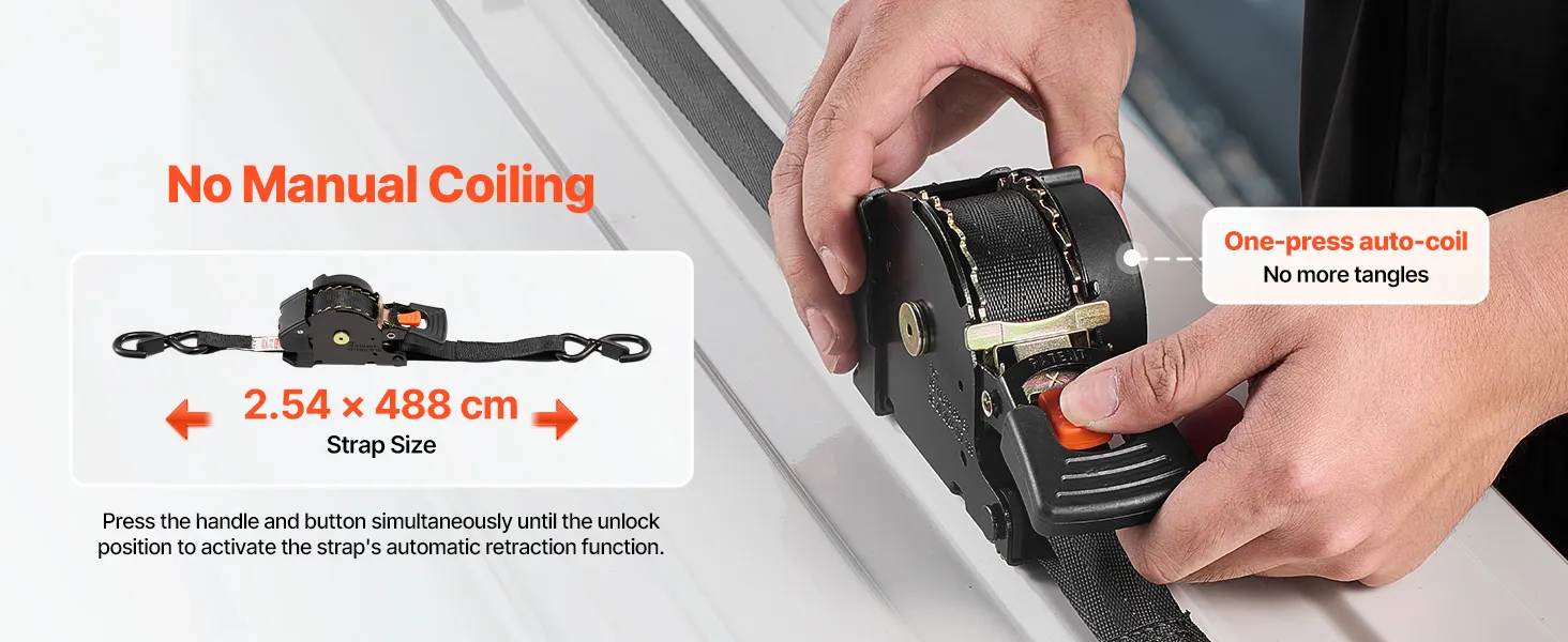 Riavvolgimento automatico con un solo tocco: basta premere il fermo e la cinghia si richiude con la cerniera, senza bisogno di caricarla manualmente, senza problemi. Le cinghie di fissaggio si ripongono più velocemente dopo traslochi