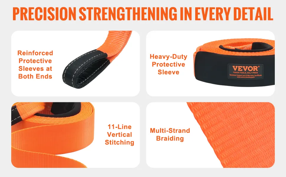 Dettagli aggiornati: la nostra cinghia di recupero è tutta una questione di robustezza! Con un trattamento superficiale avanzato, è super resistente, pronto ad affrontare qualsiasi condizione. Inoltre, le maniche protettive aggiuntive su entrambe le estremità riducono l'usura.