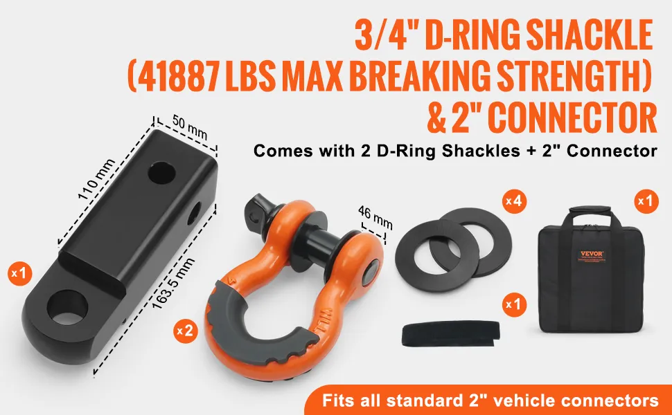 Il kit cinghia di traino include due grilli a D da 3/4". Questi grilli sono zincati per una maggiore durata. Possono gestire fino a 41.887 libbre. Ciò garantisce la massima sicurezza. Le protezioni paraurti in silicone aggiungono un ulteriore strato di protezione. Queste caratteristiche rendono le operazioni di recupero più sicure e protette. Puoi fidarti che questi grilli resisteranno alla pressione. Sono una parte importante del kit di recupero. Forniscono la tranquillità di cui hai bisogno durante le emergenze.