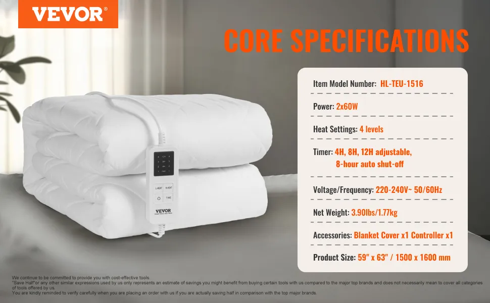 VEVOR Coprimaterasso Riscaldato, 150 x 160 cm, Scaldaletto Elettrico con Controllo 4 Impostazioni Calore, Timer 12 Ore, Spegnimento Automatico Dopo 8 Ore, Lenzuola per Materasso con Tasca Elastica