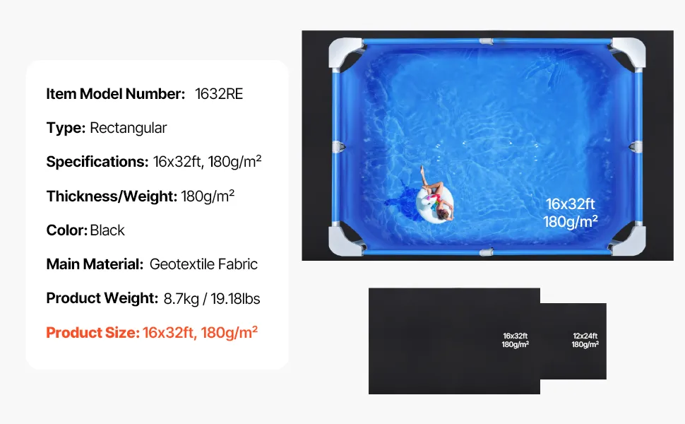 VEVOR Rettangolare Rivestimento per Piscina, Rivestimento Piscine Fuori Terra, Tappetino Piscina Extra Spesso, Materiale Tessuto Durevoli Sottofondo, 488 x 975 cm 180 g/m² Nero 8,7 kg