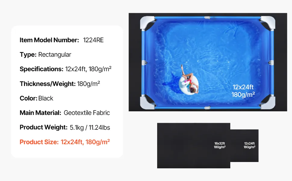 VEVOR Rettangolare Rivestimento per Piscina, Rivestimento Piscine Fuori Terra, Tappetino per Piscina Extra Spesso, Materiale Tessuto Sottofondo, 366 x 732 cm 180 g/m², Nero, 5,1 kg