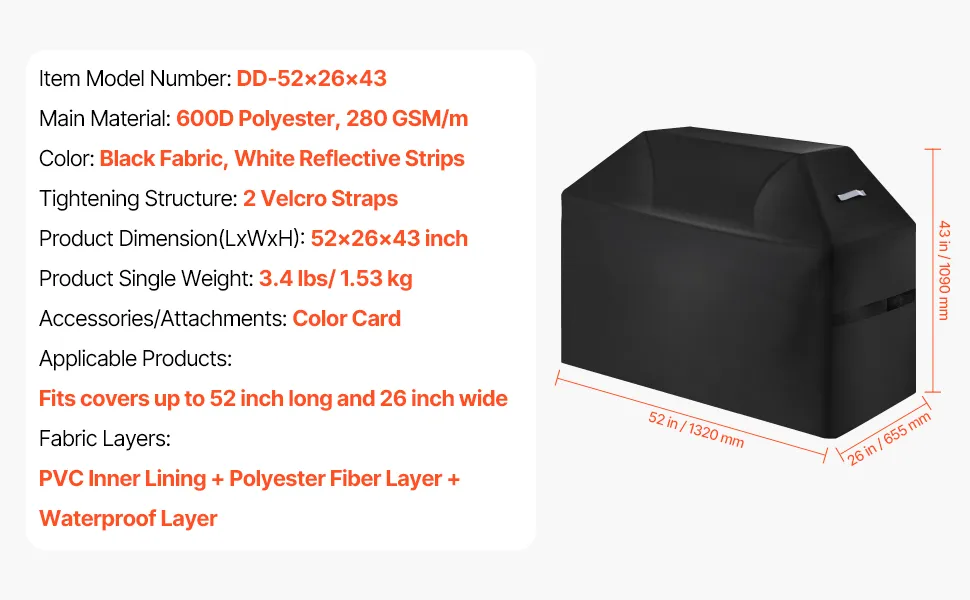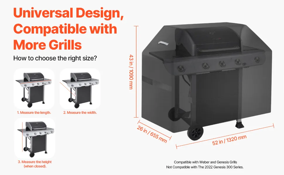Adatto a coperture fino a 52 pollici di lunghezza e 26 pollici di larghezza, compatibile con Weber, Genesis, Charbroil e altri barbecue a gas.