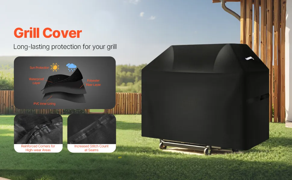 Costruito con 3 strati di materiali di alta qualità: fodera in PVC, strato in fibra di poliestere e strato impermeabile. Questa copertura per barbecue offre resistenza all'acqua. I quattro angoli sono rinforzati per resistere all'usura. Le cuciture sono strettamente intrecciate.