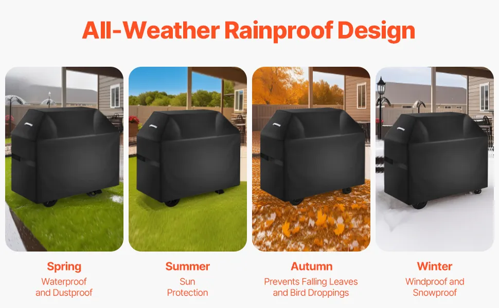 Aggiornamento impermeabile multistrato: la copertura per barbecue utilizza una fodera in PVC + strato in fibra di poliestere + strato impermeabile, con tutte le cuciture rinforzate con strisce impermeabili e rivestite con colla sigillante. Blocca completamente la penetrazione dell'acqua piovana, offrendo una protezione completa per la griglia e prolungandone la durata