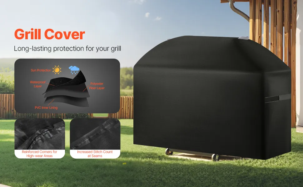 Costruito con 3 strati di materiali di alta qualità: fodera in PVC, strato in fibra di poliestere e strato impermeabile. Questa copertura per barbecue offre resistenza all'acqua. I quattro angoli sono rinforzati per resistere all'usura. Le cuciture sono strettamente intrecciate.