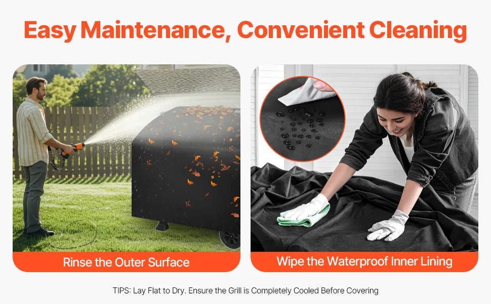 Basta sciacquare la superficie esterna e pulire la fodera interna impermeabile per rimuovere facilmente le macchie. Dopo la pulizia, stendila ad asciugare e sarà pronta per essere riutilizzata. Suggerimento: assicurati che la griglia sia completamente fredda prima di coprirla.