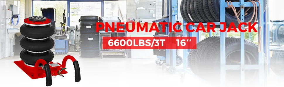 Jack a Risparmio di Manodopera: Capacità del martinetto pneumatico: 6600 libbre/3T. Altezza minima: 5,3"/135 mm. Altezza massima: 15,75"/400 mm. Ci vogliono solo 5 secondi per sollevarsi. Temperatura di lavoro: -60 ℃ ~ 50 ℃. Ingresso aria: G1/4. Il nostro cric a tripla borsa è il modo più semplice e veloce per sollevare l'auto.