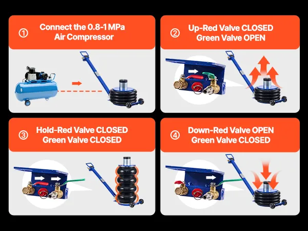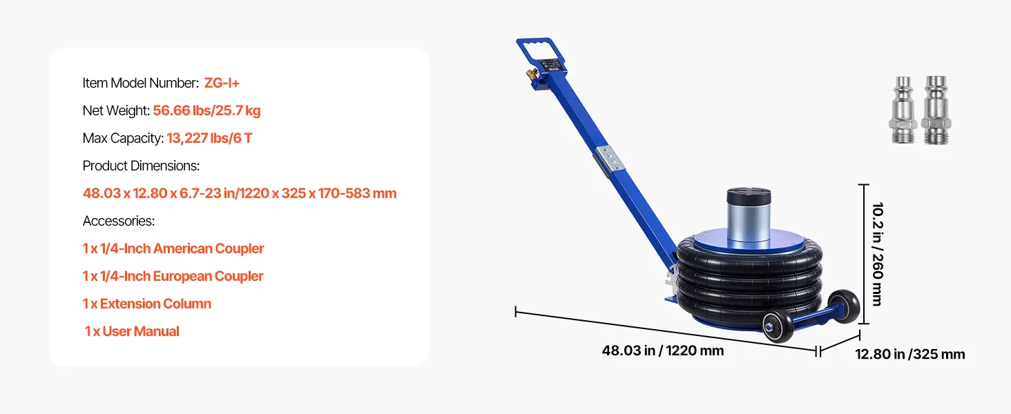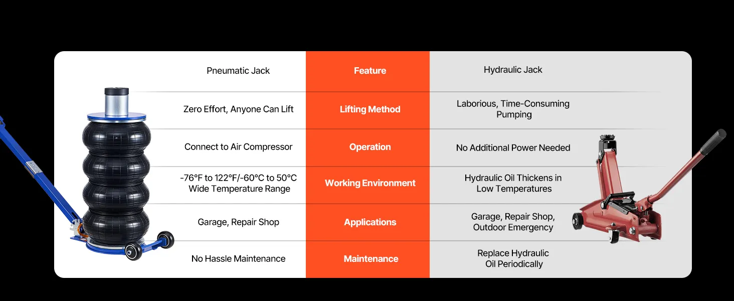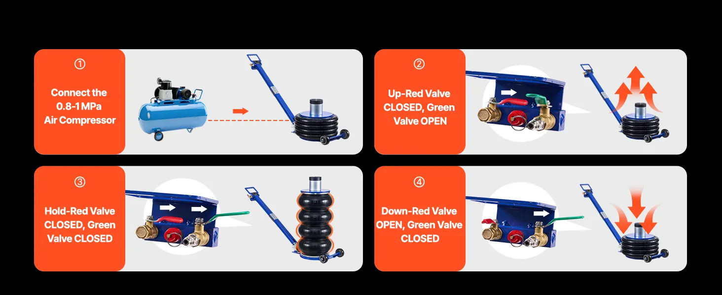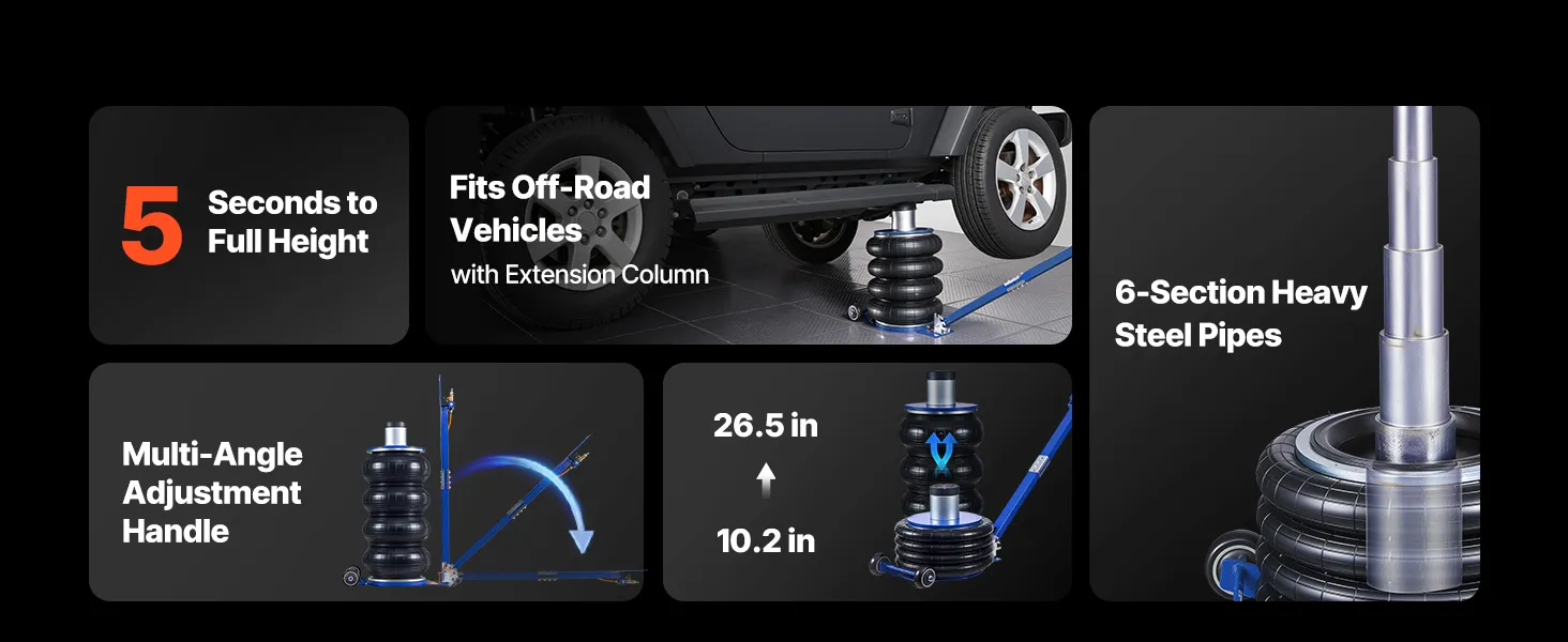 Capacità di sollevamento di 6 tonnellate: questo cric con sospensioni pneumatiche può sollevare fino a 6 tonnellate (13.227 libbre) ed è adatto a berline, SUV e camion. I soffietti rinforzati a quattro strati con sospensioni pneumatiche