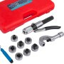 Questo espansore per tubi è dotato di 7 teste di espansione per tubi che vanno da 3/8" a 1-1/8" O.D..Il tubo di espansione idraulica manuale semplifica l'espansione da 3/8" a 1-1/8" O.D. tubi. È dotato di una taglierina affilata per tagliare il tubo e uno strumento di sbavatura che può rimuovere facilmente le sbavature lasciate dal taglio del tubo.