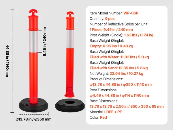 VEVOR Pali Delimitatori di Traffico, 9 Pezzi, Paletti di Sicurezza Stradale da 1140 mm con Base Riempibile e Strisce Riflettenti, Pali Delimitatori Resistenti per Cantieri Edili, Parcheggi, Rosso
