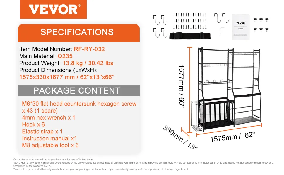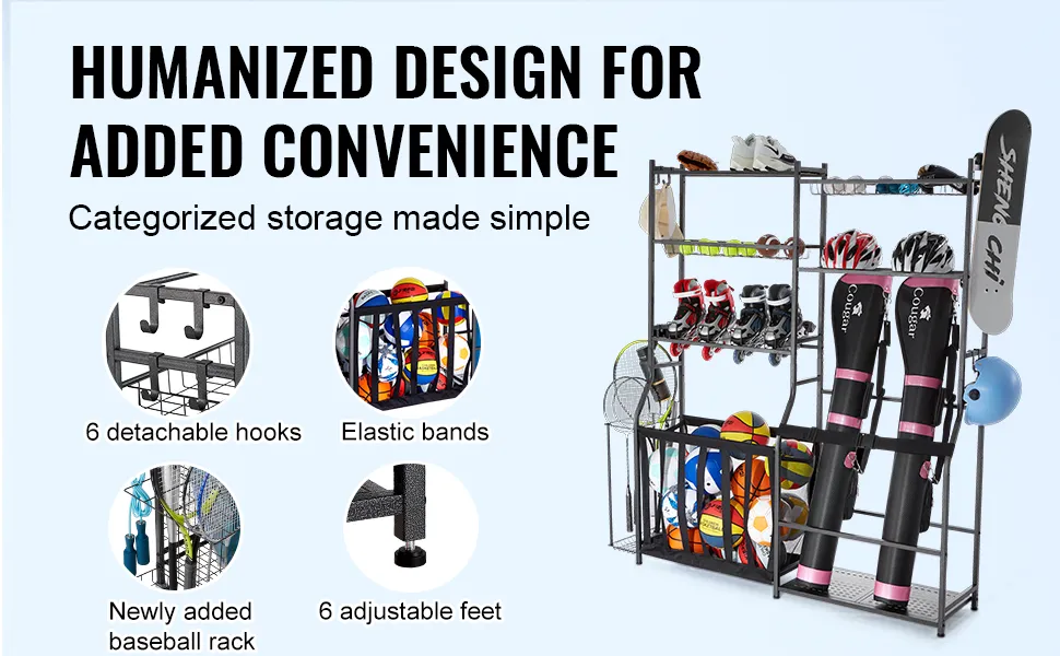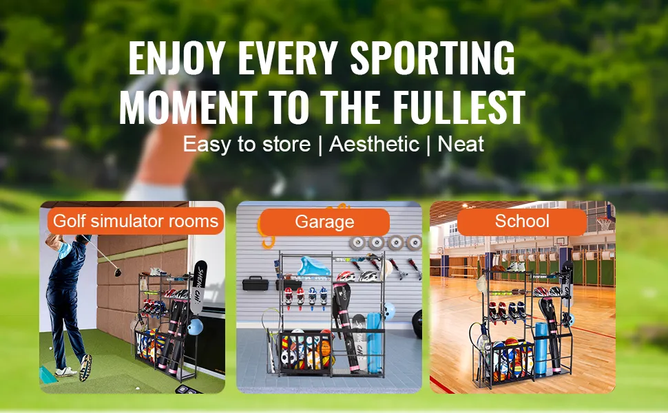 L'organizzatore da garage per riporre le sacche da golf VEVOR è progettato per contenere più sacche da golf. Si adatta facilmente a sacche di dimensioni standard. Il design include anche spazio per altre attrezzature sportive. Puoi riporre vari oggetti, rendendolo una soluzione di stoccaggio versatile. Questi ripiani e scomparti extra offrono abbastanza spazio per tutta la tua attrezzatura. Poiché l'organizzatore ha così tante sacche e accessori, è perfetto per i golfisti accaniti o gli appassionati di sport. Tutto rimane in un'unica posizione comoda, risparmiando spazio e riducendo l'ingombro.