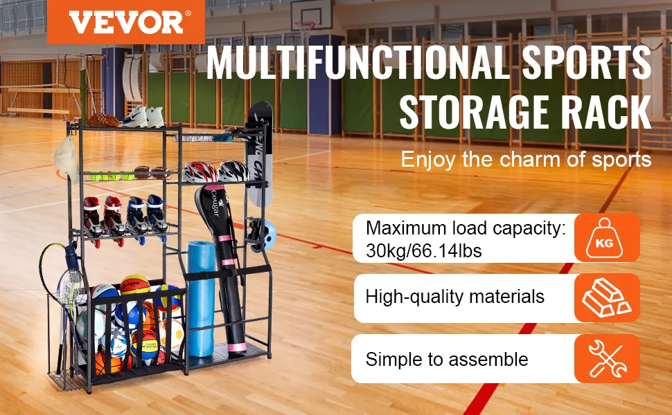 Questo organizer per attrezzature sportive è realizzato con un robusto telaio in acciaio verniciato a polvere e una rete metallica resistente, che lo rende durevole e resistente per gli anni a venire.