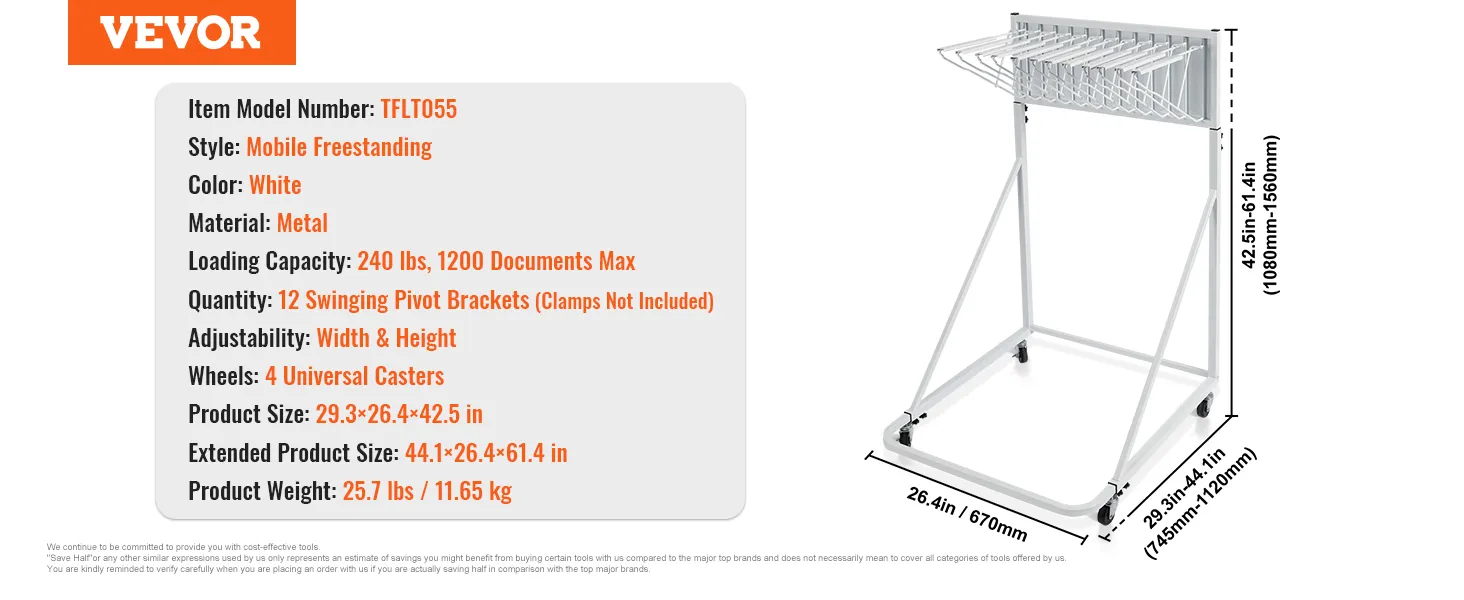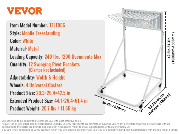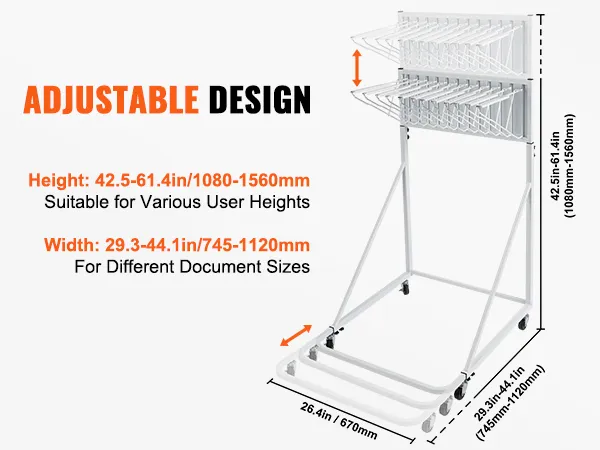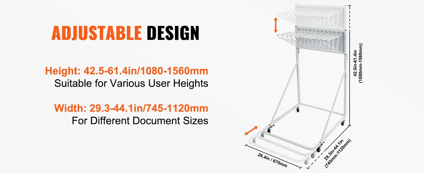 Il rack di archiviazione per disegni architettonici VEVOR si adatta a vari livelli di altezza e larghezza. Accoglie facilmente sia documenti grandi che piccoli. L'altezza varia da 42,5 a 61,4 pollici e la larghezza varia tra 29,3 e 44,1 pollici. Questa flessibilità garantisce che il rack possa contenere documenti di diverse dimensioni. Non importa se si tratta di progetti, mappe o altri documenti di grandi dimensioni, questo rack si adatta alle tue esigenze. Il design regolabile lo rende adatto a più utenti e ambienti. Ottieni un'organizzazione e una sicurezza ottimali per i tuoi documenti.