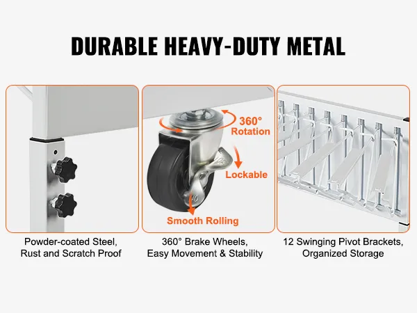 Il rack è realizzato in acciaio massiccio con rivestimento antiruggine. Garantisce un uso duraturo e resistenza all'usura. Le 4 ruote girevoli, due bloccabili, offrono una mobilità fluida. Puoi spostare facilmente il rack mantenendo al sicuro i tuoi documenti. Le ruote bloccabili forniscono stabilità quando ne hai bisogno. Questa caratteristica è perfetta per gli ambienti di lavoro affollati in cui i tuoi file rimangono al loro posto durante il trasporto. La costruzione durevole lo rende una scelta affidabile per l'uso quotidiano.