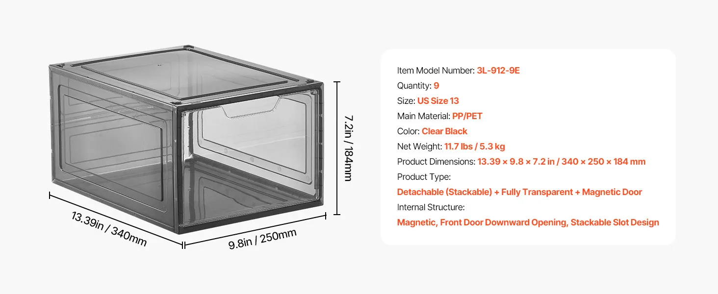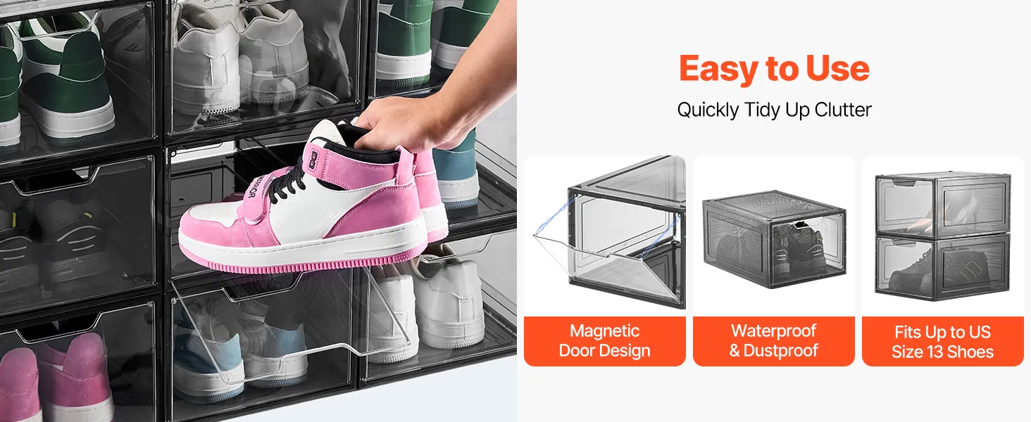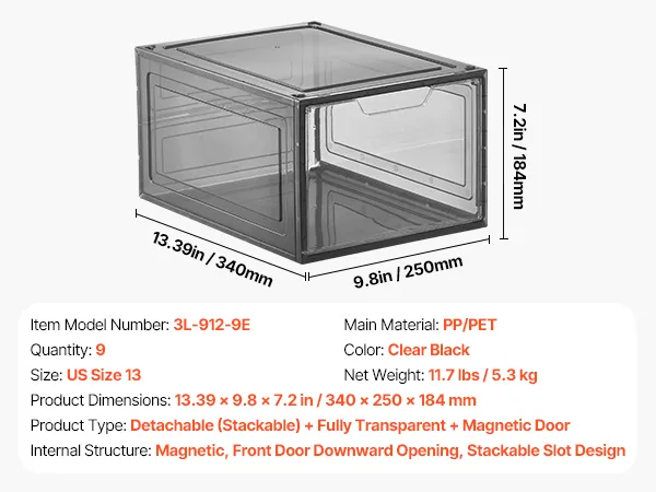 VEVOR Scatole Porta Scarpe, Adatte Fino alla Taglia 13 USA, 9 Scatole Porta Scarpe Trasparenti Impilabili con Porta Magnetica, Contenitori in Plastica per Stivali e Cappelli, Nero Trasparente