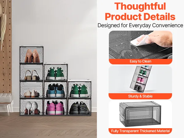 Design impilabile: le superfici antiscivolo superiori e inferiori consentono un impilamento stabile, rendendo le scatole per scarpe trasparenti facili da organizzare in qualsiasi angolo della casa
