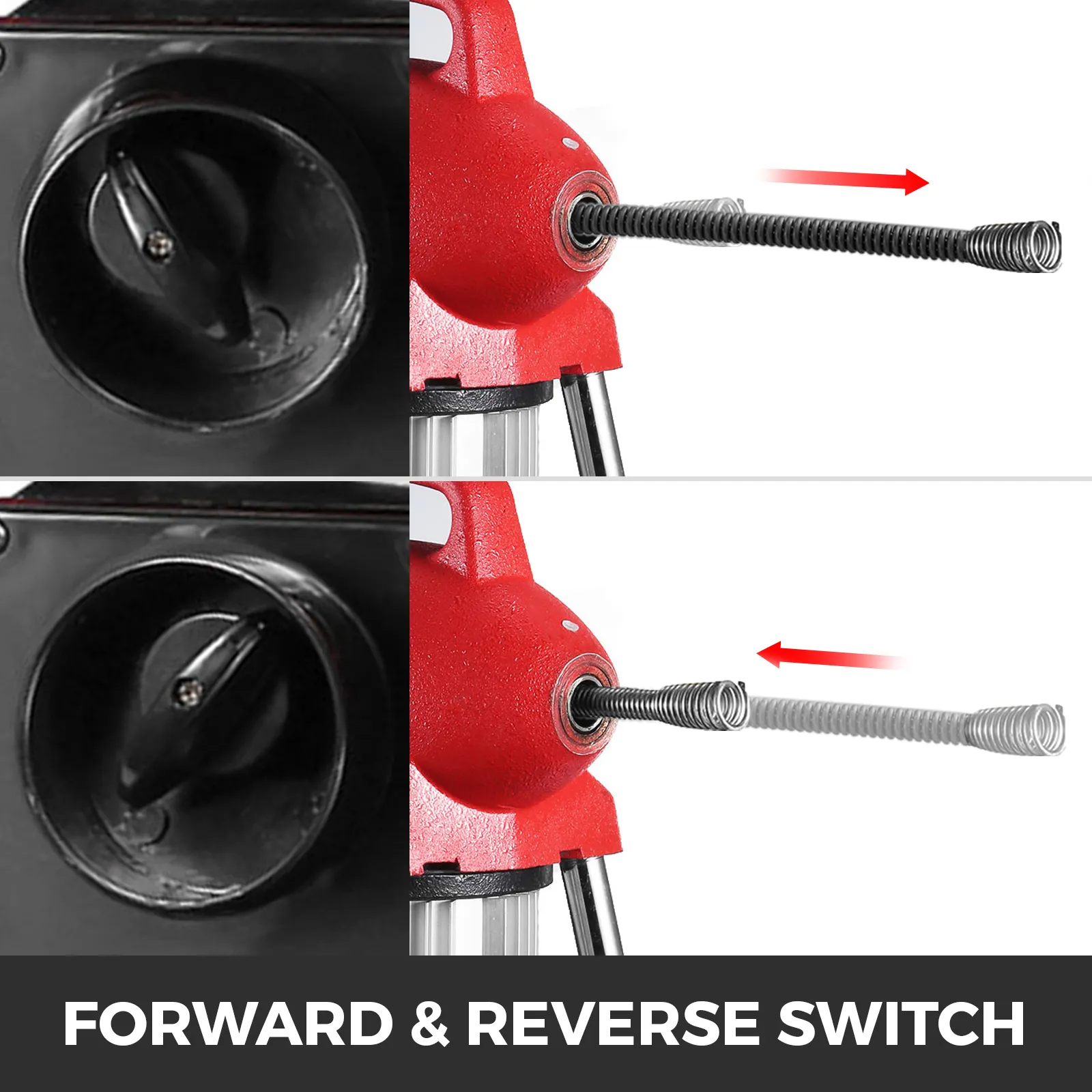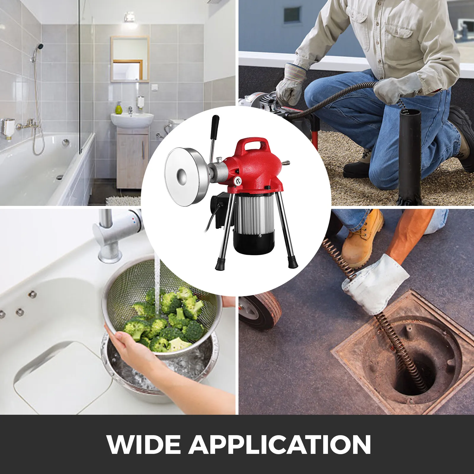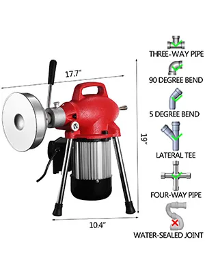 Lo scovolino elettrico professionale per fognature è realizzato in acciaio metallico. È applicabile per la pulizia di tubazioni bloccate di diametro di dimensioni da 3/4'' - 4'' e guida fino a 100 piedi di cavo, può utilizzare cavo da 3/8'' e cavo da 5/8'', include otto punte per utensili da taglio e 20 m (che ogni cavo viene fornito con un connettore maschio + un connettore femmina) di cavo da 5/8''.