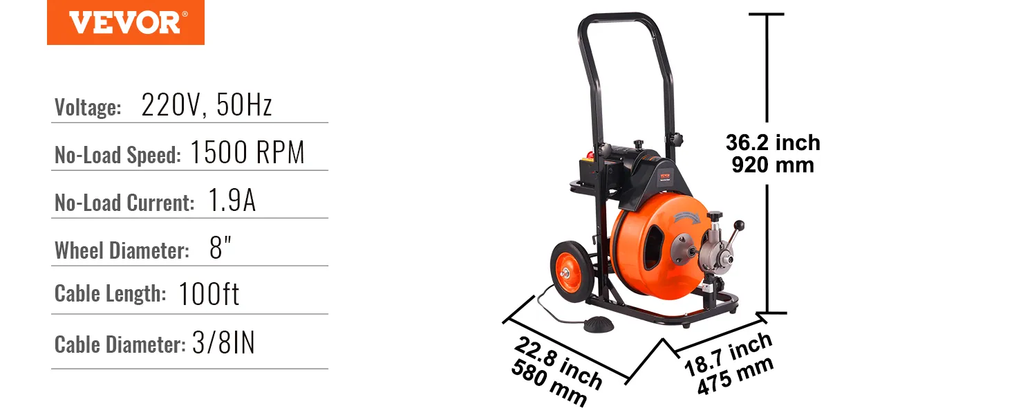 Durevole & Sicura: la macchina sturatubi è dotata di un motore di alta qualità alla velocità di 1500 giri/min. È dotata di un tamburo semicoperto che consente di vedere facilmente la lunghezza residua del cavo e di un telaio in acciaio migliorato con uno speciale rivestimento che ne previene la ruggine e ne prolunga la durata. Inoltre, è dotato di un interruttore di circuito con guasto a terra incorporato per proteggere gli operatori dalle scosse elettriche.