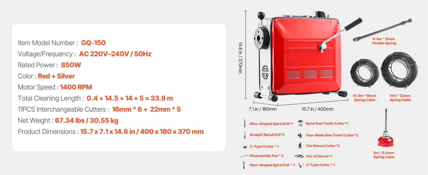 Dotato di un motore da 850 W a 1400 giri/min, questo sturalavandini offre prestazioni potenti e stabili per la disostruzione degli scarichi. La sua rotazione ad alta velocità e l'efficiente potenza in uscita garantiscono una pulizia profonda e accurata.
