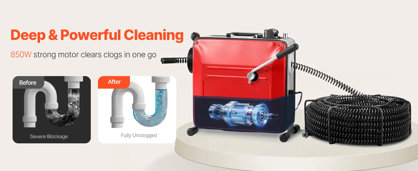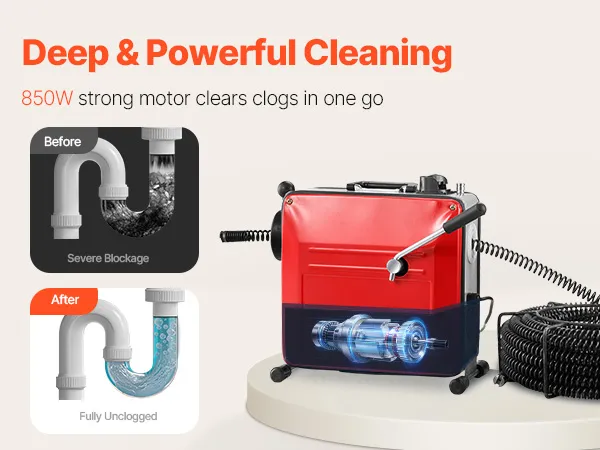 Sblocco efficiente: lo sturalavandini elettrico è dotato di un motore da 850 W a 1.400 giri/min, che fornisce un'elevata potenza per una pulizia profonda ed efficiente. Grazie al controllo avanti/indietro, la gestione dei cavi è semplificata