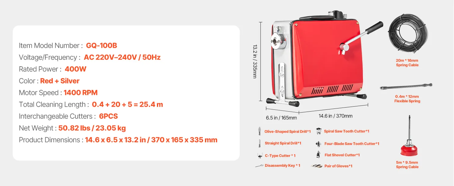 Alimentato da un potente motore a 1400 giri/min, questo sturalavandini offre prestazioni potenti e stabili per sturare gli scarichi. La sua rotazione ad alta velocità e l'efficiente potenza di uscita garantiscono una pulizia profonda e accurata.