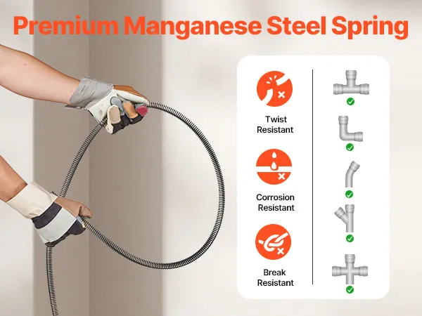 Realizzata in acciaio al manganese di alta qualità, la molla è resistente alla ruggine, alla corrosione e all'aggrovigliamento, durevole nell'uso e in grado di passare agevolmente attraverso più tubi curvi.
