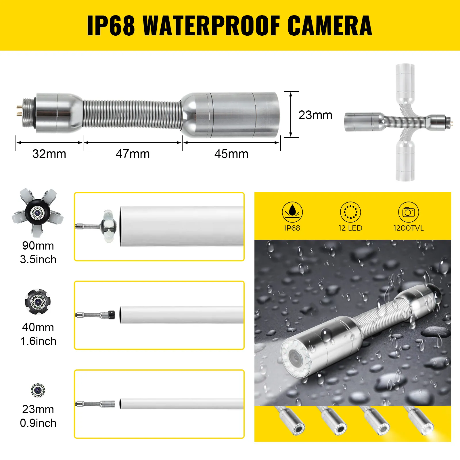 Ci siamo assicurati che la telecamera in acciaio inossidabile avesse un grado di impermeabilità IP68 che ti evita problemi di danni causati dall'acqua. 12 luci LED con luminosità regolabile offrono un'illuminazione eccellente anche negli ambienti più bui. Inoltre, due coperture per la fotocamera (φ 40 mm, φ 90 mm) forniscono una maggiore protezione.