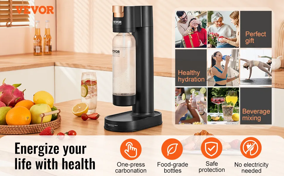 Il produttore di acqua frizzante VEVOR è perfetto per uno stile di vita sano. Ti aiuta a creare acqua gassata naturale. Ciò riduce lo stress corporeo e fornisce una bevanda rinfrescante. Puoi divertirti a preparare bevande colorate in qualsiasi momento e ovunque. Puoi preparare soda, acqua, succo, vino, cocktail o birra. È felicità per gli amici. Questo produttore di acqua frizzante migliora la tua idratazione quotidiana. Puoi goderti il piacere di preparare la tua soda con questa fantastica macchina. Sarà uno strumento essenziale per le persone attente alla salute. Quindi, fai in modo che ogni bevanda conti con questo carbonatore d'acqua.