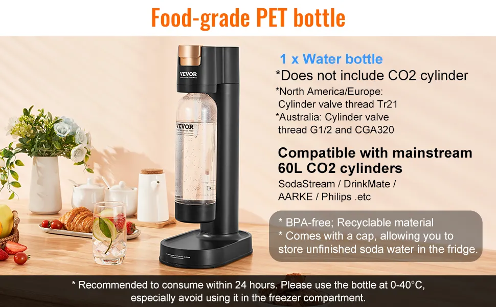 La capacità della bottiglia da 1L, dotata di tappo, consente di conservare in frigorifero l'acqua frizzante non finita. Si consiglia di bere acqua entro 24 ore. Si prega di utilizzare la bottiglia a temperature comprese tra 0-40°C.