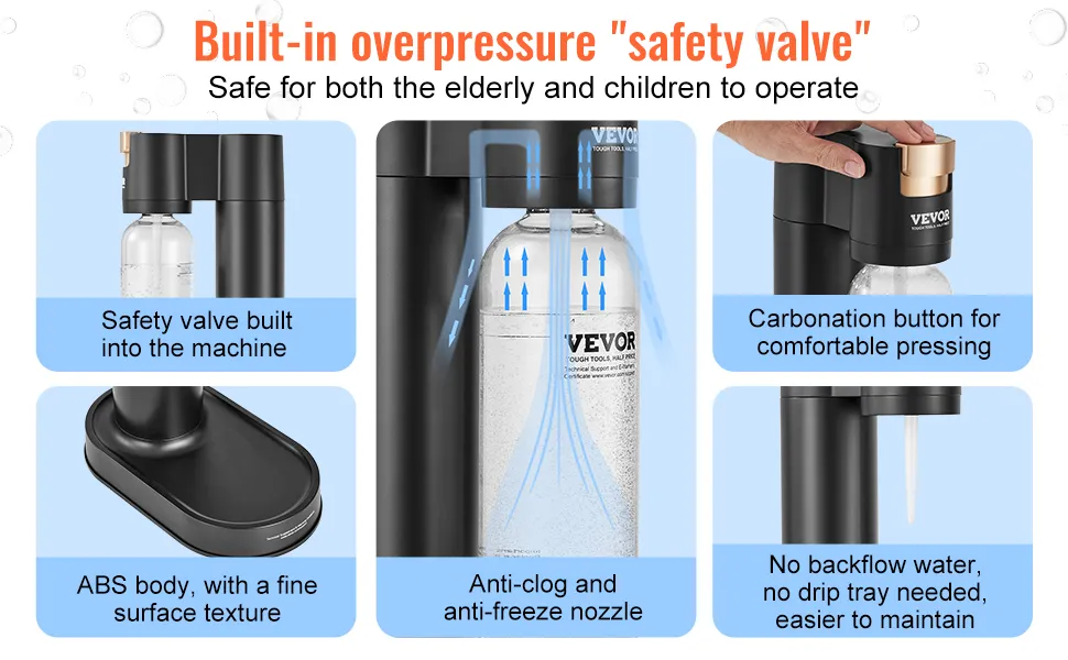 La sicurezza è una delle caratteristiche principali di questo produttore di acqua frizzante. La valvola di sicurezza rilascia il gas in eccesso quando la pressione è alta. Ciò garantisce la depressurizzazione automatica e previene le esplosioni. Il design dell'ugello impedisce l'intasamento o il congelamento. È affidabile e sicuro da usare. Puoi goderti la tranquillità mentre prepari le tue bevande preferite. Questa macchina è progettata pensando alla tua sicurezza. È perfetta per le famiglie e le persone che danno priorità alla sicurezza. Prepara acqua frizzante con sicurezza.
