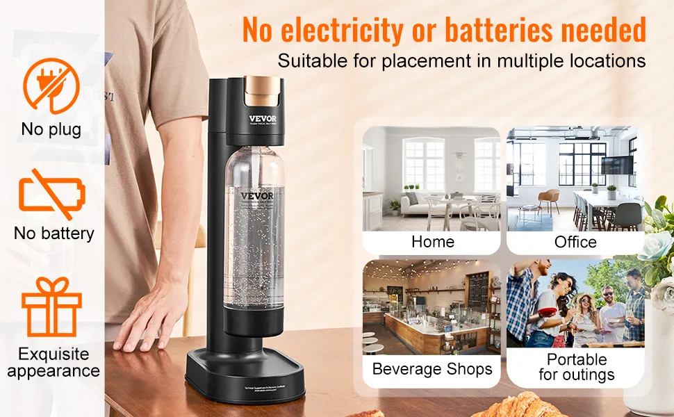 È portatile e senza batteria. Non necessita di elettricità o batterie. Questo lo rende più versatile e portatile. Puoi portarlo in campeggio o alle riunioni. Si adatta perfettamente alla tua casa o al tuo ufficio. Il profilo elegante lo rende un'aggiunta di stile a qualsiasi spazio. È perfetto per bar/caffetterie. Puoi gustare acqua frizzante ovunque, in qualsiasi momento. La praticità di questa macchina è ineguagliabile.
