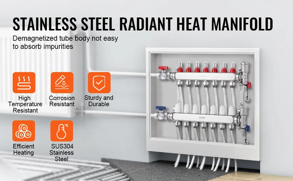 Costruito per durare: il collettore per tubi pex VEVOR è realizzato in acciaio inossidabile 304 durevole, resistente alle alte temperature, alla corrosione e alla pressione. Mantiene la sua forma e integrità per un uso a lungo termine, offrendo una maggiore conduttività termica.