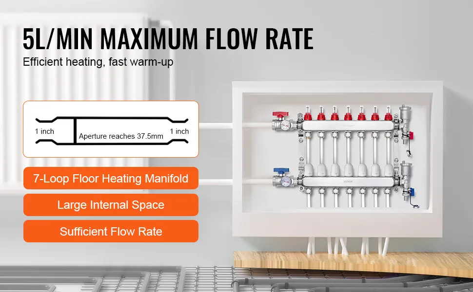 Prova un riscaldamento rapido ed efficiente con il nostro collettore di riscaldamento radiante a pavimento pex, con una portata fino a 5 l/min. Questa elevata capacità di portata assicura un riscaldamento rapido e prestazioni ottimali, mantenendo un calore costante e confortevole.