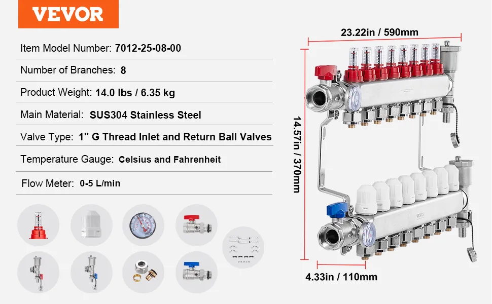 Scegli il collettore di calore radiante a 8 rami VEVOR per un riscaldamento rapido e affidabile. Con una portata fino a 5 L/min, fornisce calore rapido e costante in tutto lo spazio. La struttura in acciaio inossidabile SUS304 offre un'eccezionale resistenza alle alte temperature.