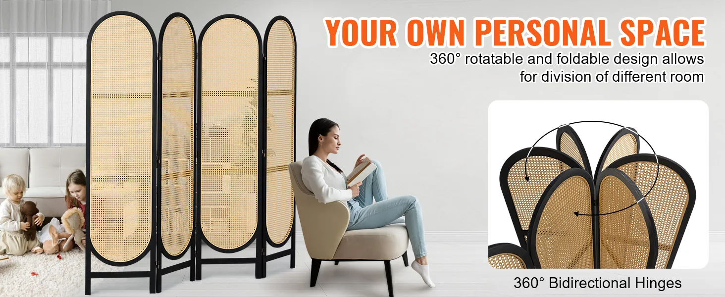 VEVOR Divisorio per Ambienti a 4 Pannelli, Schermi per Privacy Pieghevoli Portatili in Rattan Intrecciato a Mano con Cerniere, Divisorio Parete Indipendente Legno per Soggiorno Camera da Letto Marrone