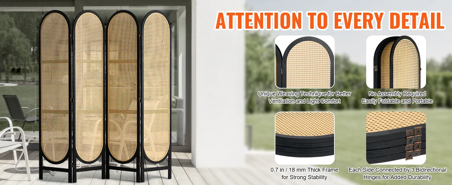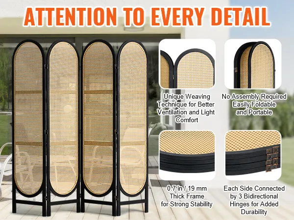 I piedini di supporto rinforzati abbinati a una struttura in legno ispessita, con pannelli collegati da tre cerniere a doppio senso, rendono lo schermo divisorio più stabile e garantiscono una maggiore tranquillità durante l'uso.